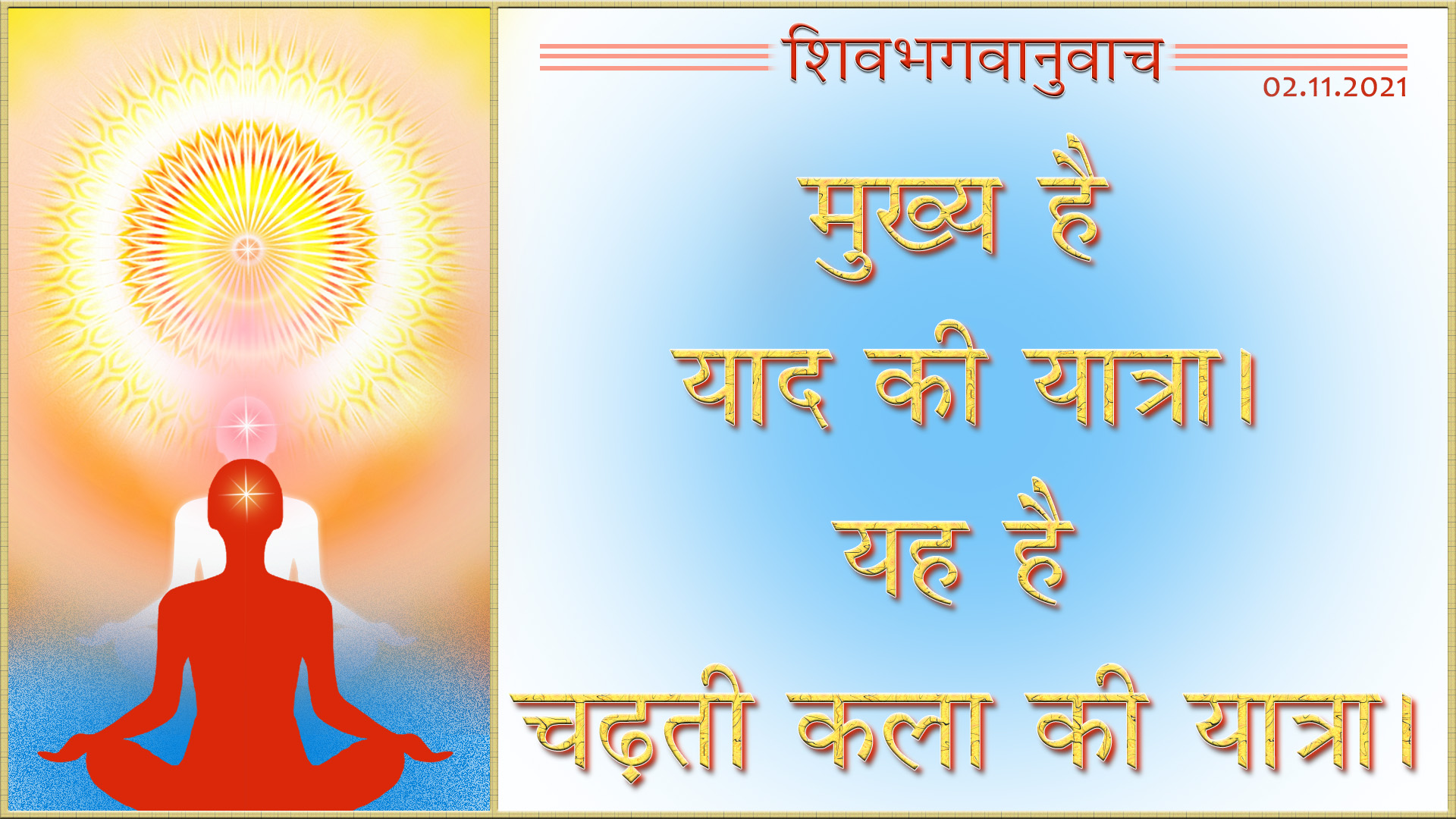 मीठे-मीठे सिकीलधे बच्चों प्रति मात-पिता बापदादा का याद-प्यार और गुडमार्निंग। रूहानी बाप की रूहानी बच्चों का नमस्ते।