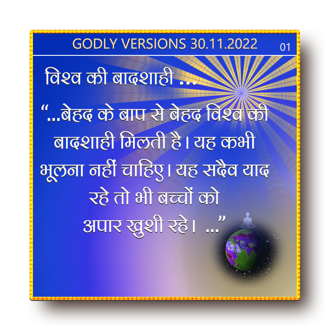 1) अमृतवेले उठ बाबा से मीठी -मीठी रूहरिहान करनी है, फिर भोजन खाते, कामकाज करते बाबा की याद में रहना है, देह के संबंधों को भूल आत्मा भाई-भाई हूँ, यह दृष्टि पक्की करनी है।
