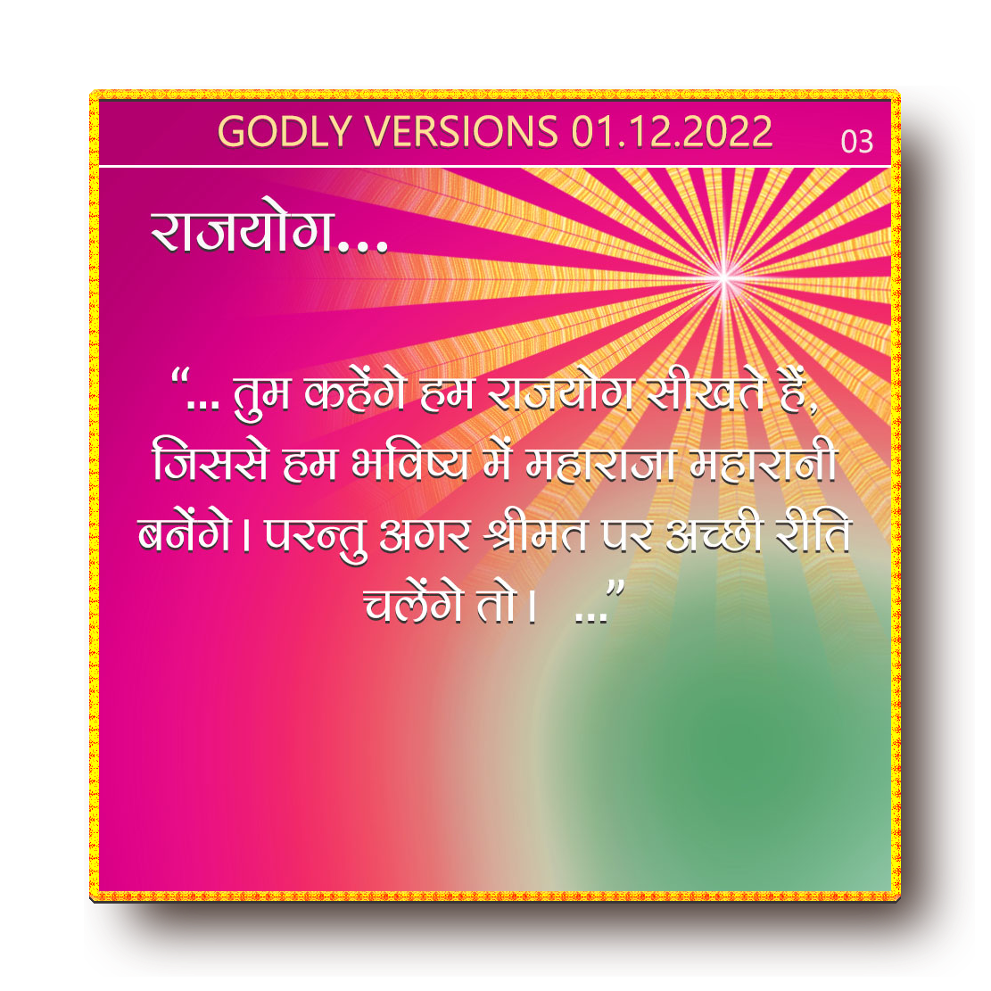- तुम कहेंगे हम राजयोग सीखते हैं, जिससे हम भविष्य में महाराजा महारानी बनेंगे।
